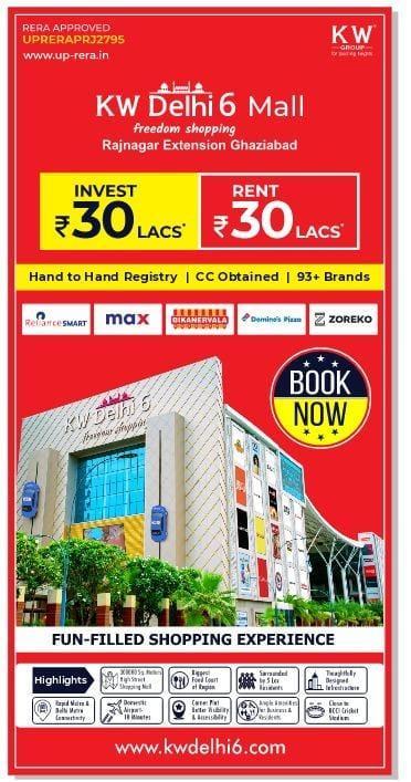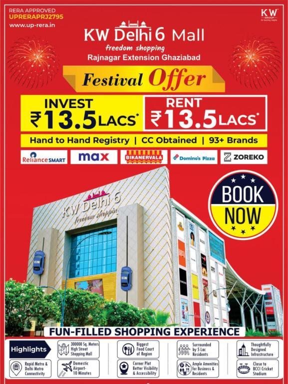 KW Delhi 6 is a prominent high-street shopping mall located on the NH-58 Bypass in Raj Nagar Extension, Ghaziabad, Uttar Pradesh. Developed by KW Group, the mall spans approximately 4 acres and features over 683 retail shops, hosting more than 85 national and international brands. It offers a diverse mix of shopping, dining, and entertainment options, making it a significant commercial hub in the region. Key Highlights: