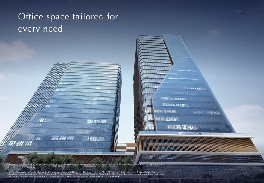 �� Project Highlights • Mixed-use setup: Street-front retail shops & kiosks, office floors (G+27), lounge-level food courts, and an upcoming multiplex/amphitheatre • Modern architecture: Glass façades, open layouts, double-height ceilings in retail, customisable office plates, central HVAC, and IT-ready backbone • Amenities: High-speed elevators/escalators, multi-level parking, concierge lobby, uninterrupted power/water, Wi-Fi lounges, centralized security & fire systems • Eco-friendly design: Landscaped promenades, rainwater harvesting, waste management, green terraces