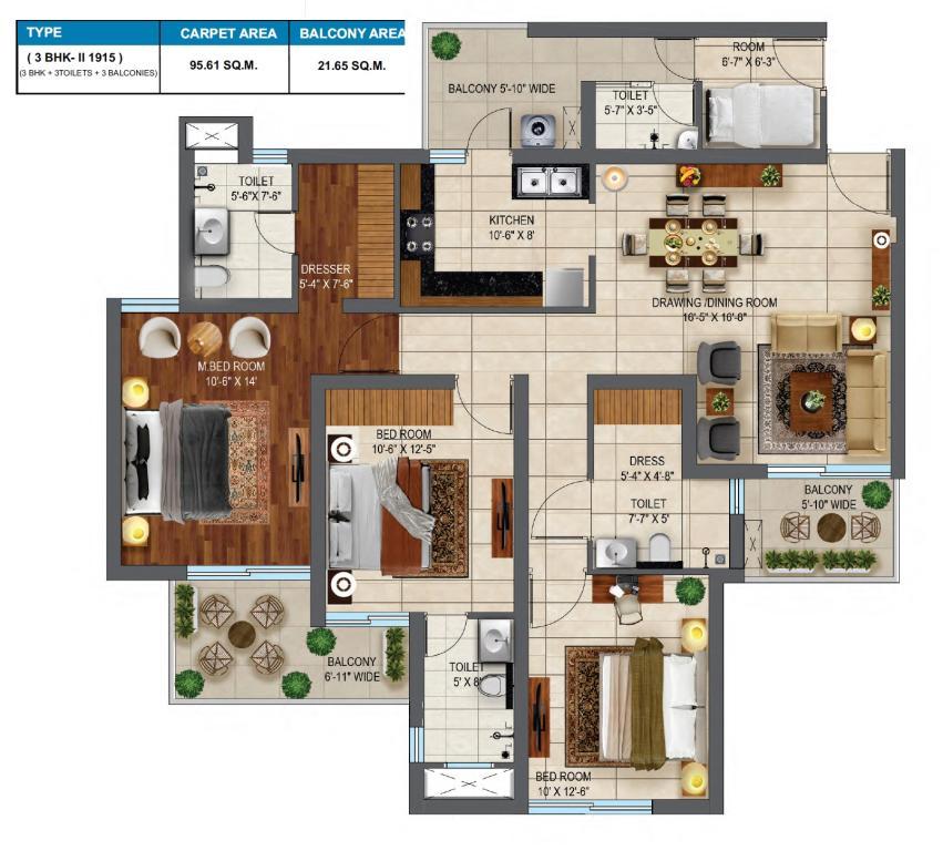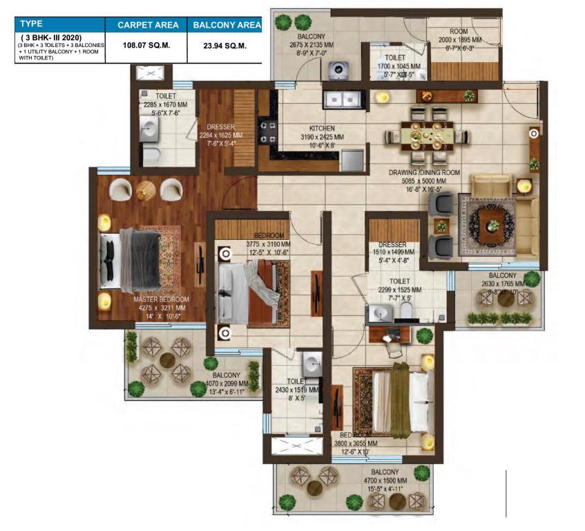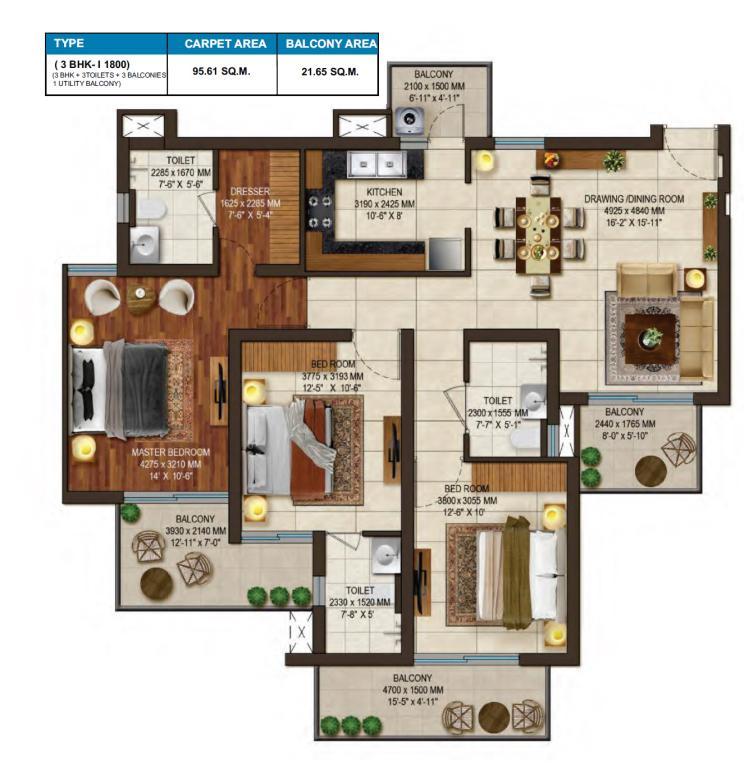��️ Apartment Mix & Pricing Configuration Super Area Approx Price 3 BHK + 3T 1,800 sq ft ₹1.17 Cr – ₹1.62 Cr 3 BHK + 4T 2,020 sq ft ~₹1.31 Cr – ₹1.81 Cr 4 BHK + 5T [+Study] 2,620 sq ft ~₹1.70 Cr – ₹2.35 Cr • Base price starts around ₹83 L–₹95 L, depending on configuration
