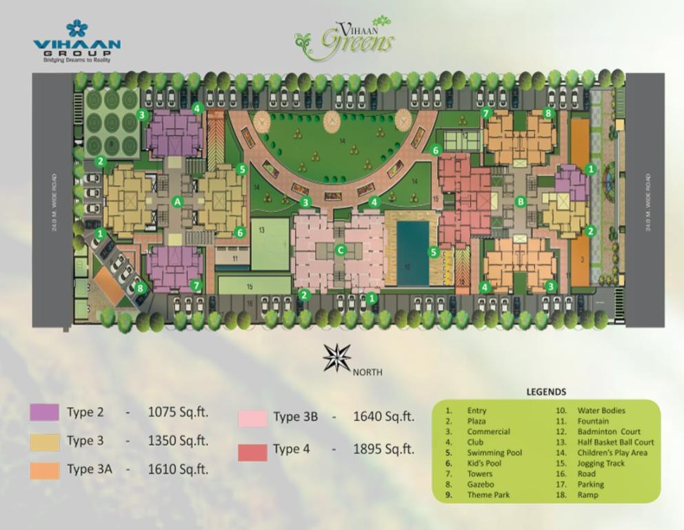 �� Amenities & Specifications • Lifestyle: Clubhouse, swimming pool (adult/kids), gym, banquet hall, café/food court • Sports & Outdoor: Badminton court, kids' play area, jogging/cycling track, landscaped gardens . • Utilities & Security: 100% power backup, CCTV, rainwater harvesting, fire safety, multipurpose room . • Specifications: o Vitrified flooring, wooden laminated master bedrooms o POP ceilings, teak/solid wood doors, premium fittings, powder-coated windows