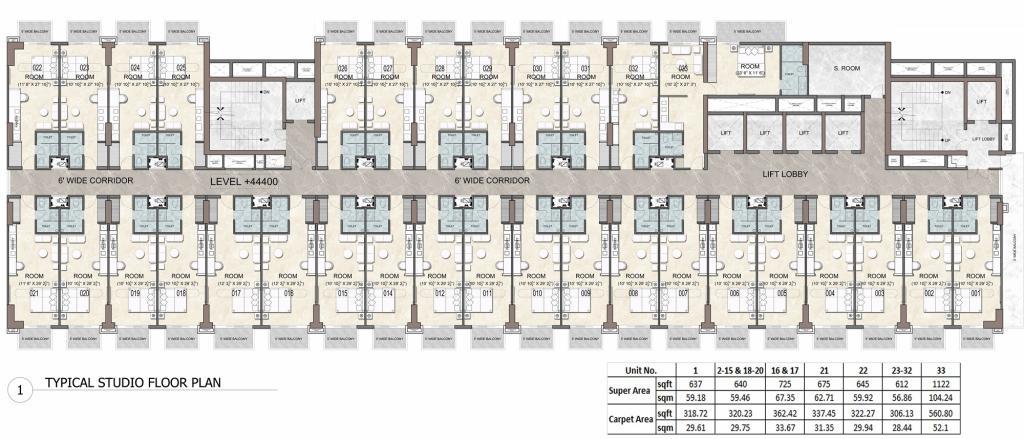 ��️ Apartment & Studio Configuration • Studio apartments: Approx. 640 sq ft (RERA saleable) priced around ₹ 76.74 L; ~710 sq ft at ~₹ 85.14 L • Commercial studios/corporate suites: ~860 sq ft
