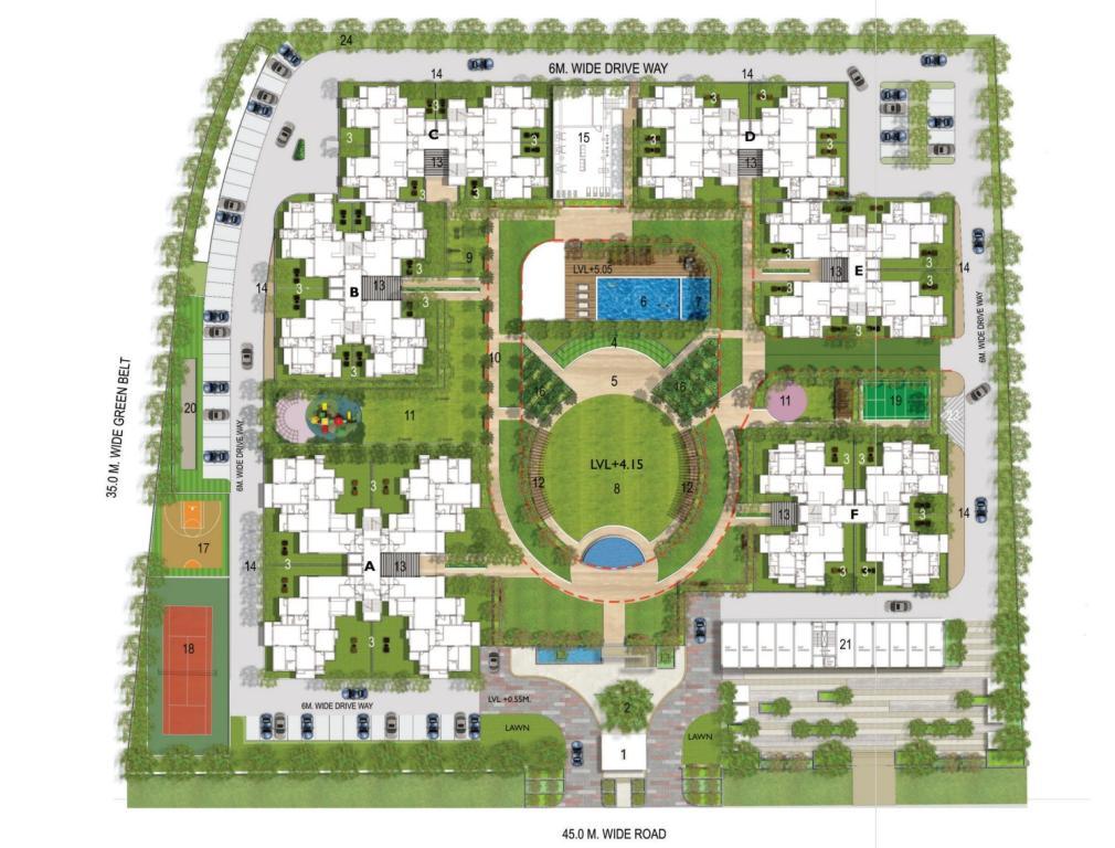 ��️ Amenities & Features • Exceptional amenities including: high end gym, swimming pools, sauna/spa, skating rink, cricket pitch, badminton/basketball courts, indoor outdoor sports facilities, party lawn/hall, yoga/meditation centre, club house, children’s play area • Built with earthquake resistant RCC structure, double high speed lifts, full power backup, 24 hour water supply, CCTV surveillance, intercom, and dedicated commercial retail space • Emphasizes IGBC Gold rated sustainable living, lush landscaping, and central green zones
