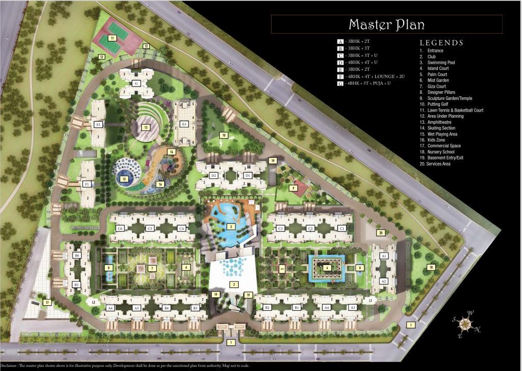 �� Thematic Design & Amenities • Egyptian-inspired architecture: Grand Sphinx entrance, themed columns, designer pillars, mist garden, palm court, temple, island court, Giza Court • Standout amenities: o India’s first 5-level cascading outdoor pool with sky bridge plus indoor pool o Clubhouse with spa, steam, sauna, jacuzzi, mini theatre, gym, restaurant o Extensive sports & recreation: tennis, badminton, basketball, skating, cricket pitch, putting golf, amphitheater, indoor/outdoor games, jogging tracks, children’s zones . o Eco-friendly: IGBC Gold rating, solar panels, rainwater harvesting, waste management . o Safety: 24×7 security with CCTV, RCC earthquake-resistant structure