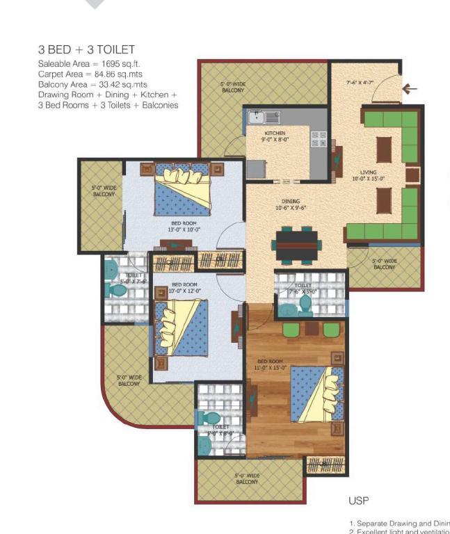 • Open-perimeter designs: every flat is 3-sided open for light and ventilation • 75% open/green space, landscaped gardens • Amenities include swimming pools (incl. infinity), gym, indoor/outdoor sports courts, squash, sauna, skating rink, amphitheatre, multipurpose hall, jogging track, meditation area, fenced parking, full power backup, fire safety