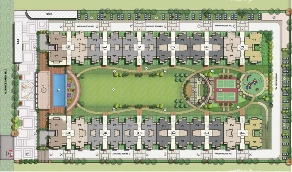 • Outdoor Recreation: Swimming pool (kids + main), open badminton/basketball/tennis courts, jogging/cycling tracks, landscaped gardens, amphitheater • Indoor & Social Facilities: AC gym, clubhouse, multi-purpose hall, beauty salon, creche, laundromat, coffee lounge, in-house grocery, doctor on call, foosball/lounge areas • Sustainability & Security: Rainwater harvesting, organic waste composter, 24×7 CCTV/security, video door-phone, power backup, dedicated lobbies, elevators, fire protection & wheelchair-friendly infrastructure