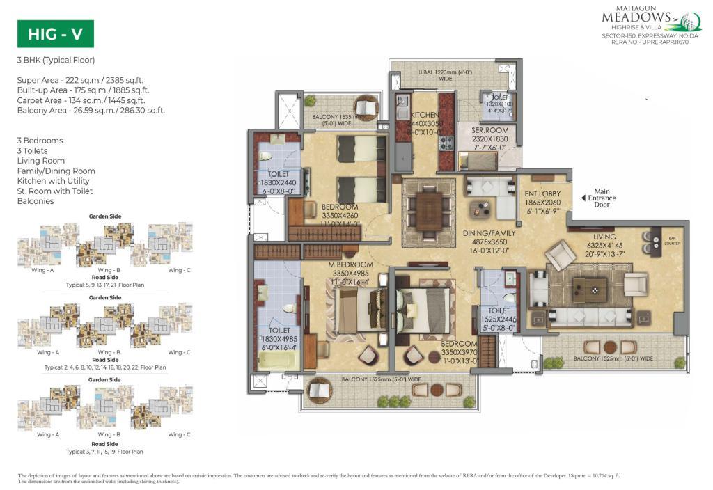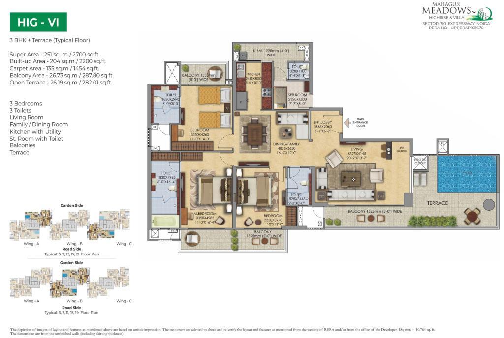 • Developer: Mahagun Group • Location: Sector 150, Noida (off the Noida–Greater Noida Expressway) • RERA ID: UPRERAPRJ1670 • Land Size: ~7 acres with ~70% green and open space • Unit Count & Configuration: Approximately 308–370 units across 2 towers (G + 24 floors), offering 2 BHK + study, 3, 4 BHK apartments and 5 BHK villas with sky terraces and private pool