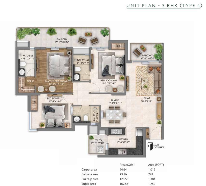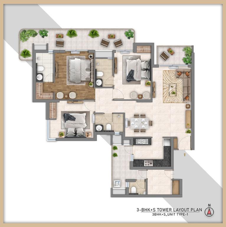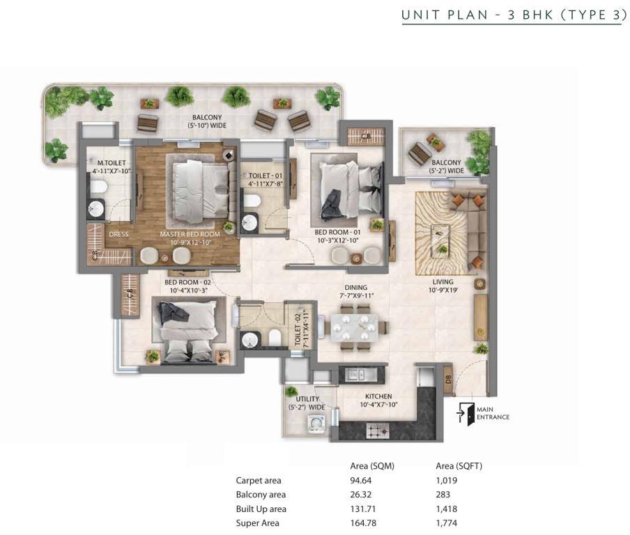 • Offers exclusively 3 BHK units, some with servant room (3 BHK + Servant). • Super built up area ranges from approximately 1,750 to 1,950 sq ft, with carpet area around 1,019 sq ft (for Type 4) up to 1,118 sq ft. • Designs feature 3 sided open layout, maximizing ventilation and natural light, along with modular kitchens, spacious dining/living zones, city view balconies, and Vastu compliant layouts.