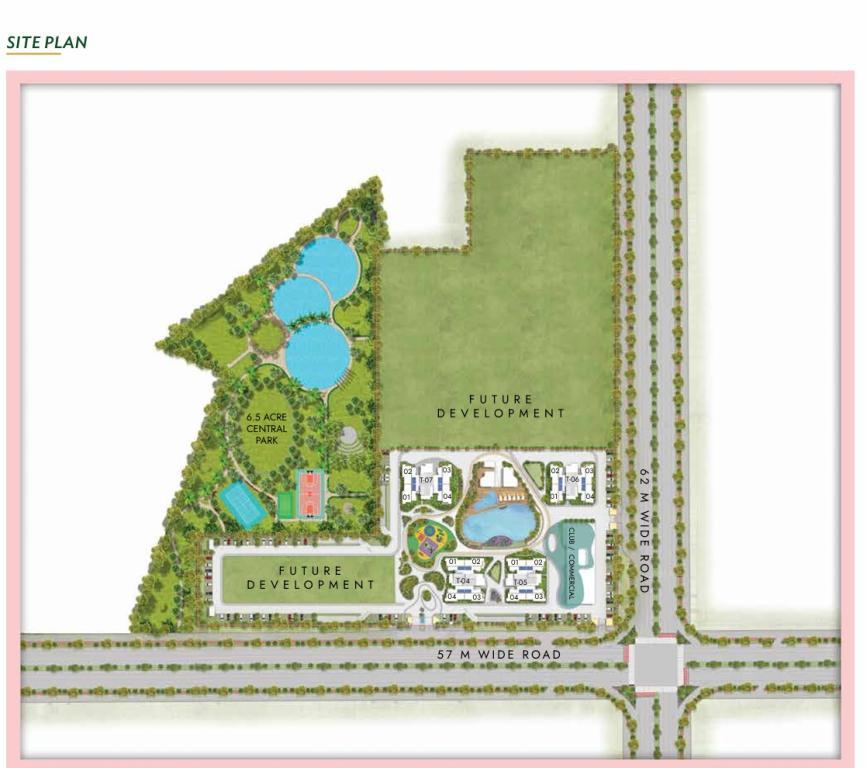 • World class amenities include a 30,000 sq ft clubhouse, Olympic size pool, gym, spa, sports courts (squash, tennis, basketball), children’s play zones, amphitheater, mini theatre, skating rink, and more. • Green and sustainable features: rainwater harvesting, solar energy, energy efficient LED lighting. Around 70% area is open green space, with extensive landscaping. • Security & convenience: 24×7 CCTV, security staff, reliable power backup, water treatment plant, EV charging, and reserved/visitor parking. • A planned community ecosystem offering cultural events, workshops, and sports competitions to foster social engagement.