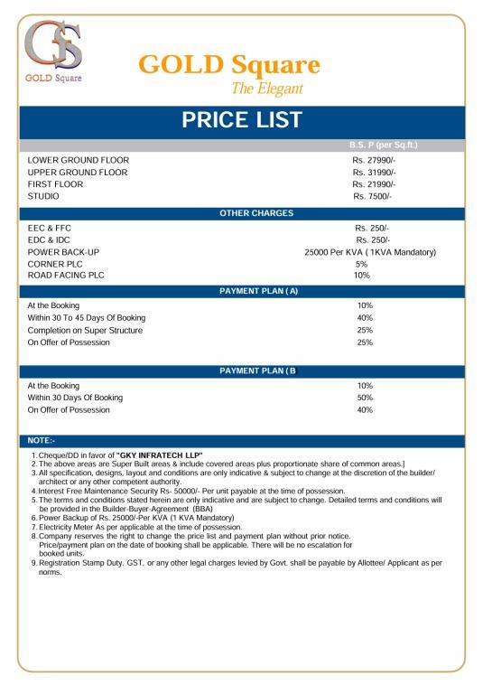 ⚙️ Quick Breakdown Option Size (sq.ft) Price Range Furnishing Notes Gold Square Studio Unit ~661 ₹50 Lac Not specified Combined shop + studio setup
